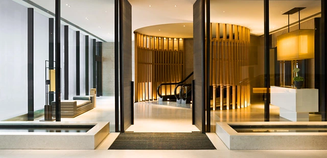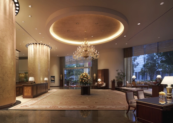 The stunning lobby, framed by black marble columns with broad spiral staircases that lead to the restaurants, paves the way to restaurants, meeting rooms and a grand ballroom. — Forbes Travel Guide