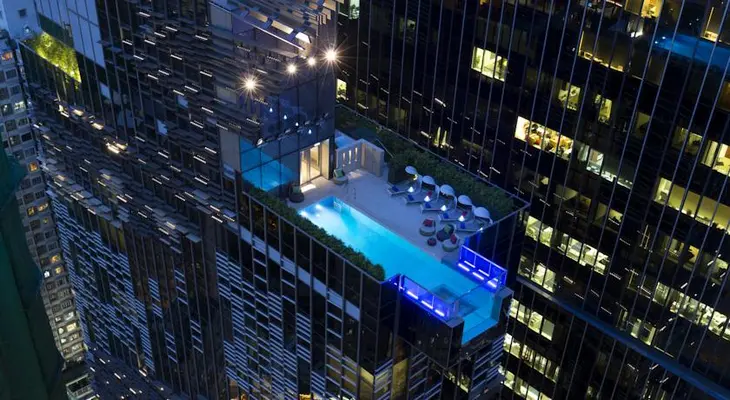 "Hotel Indigo's rooms are stunning, but the hotel's true appeal is found in its common spaces and exteriors: a bronze dragon made of solar fins wraps the building and a dramatic, glass-bottomed infinity pool juts out over the street"