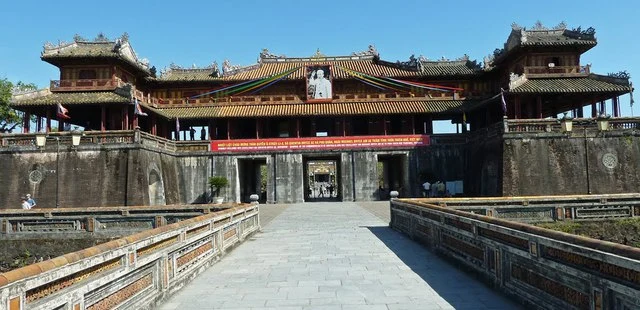 “On top of the gate is Ngu Phung (Belvedere of the Five Phoenixes); on its upper level is a huge drum and bell.”