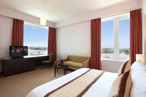 “Formerly the Mercure, this hotel soars above the Perfume River in a prime location and has rooms with polished wood furnishings, hip bathrooms, balconies and all mod cons.”