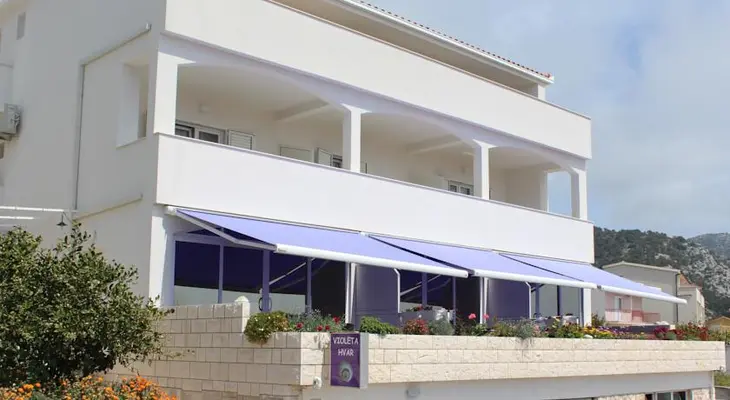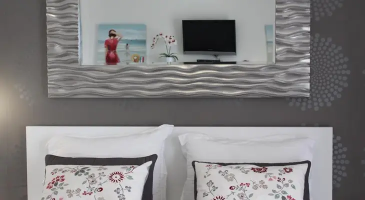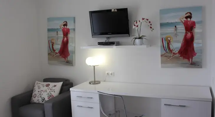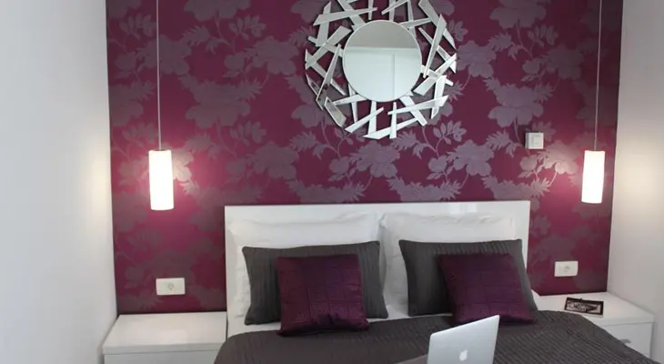 “White walls are offset with large-scale island images in this schmick apartment block, just above the town.”