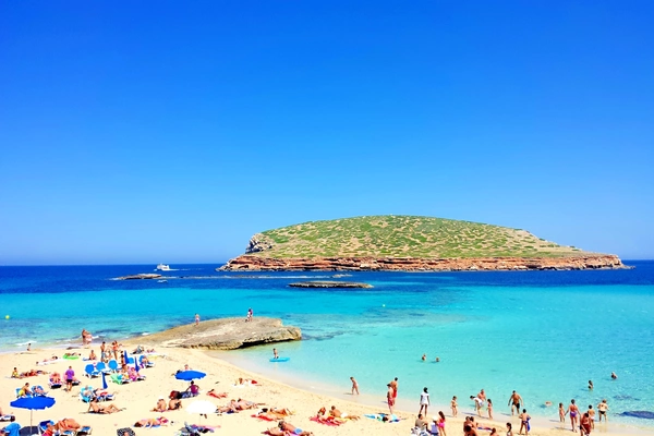 “Occupying a low-lying headland, the sublime beach of Cala Conta has very shallow offshore waters which are fabulously clear.”