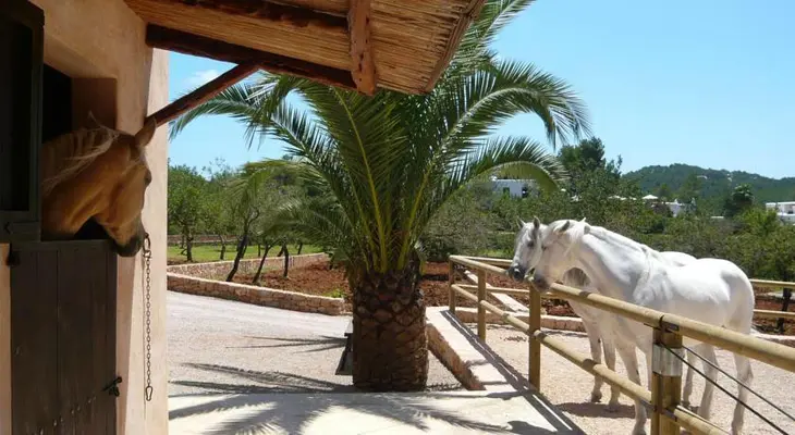 "Above terraces of almond and other fruit trees, and amid close-clipped lawns bordered by a kaleidoscope of roses, this much modified Ibizan farmstead has 17 exquisitely decorated and furnished rooms." Full review