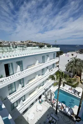 “Housed in an iconic and charming Art Deco building, the 52-room Hotel Es Vive is a chic, upscale, party property in a quiet area a block from a sandy beach in Ibiza Town.”