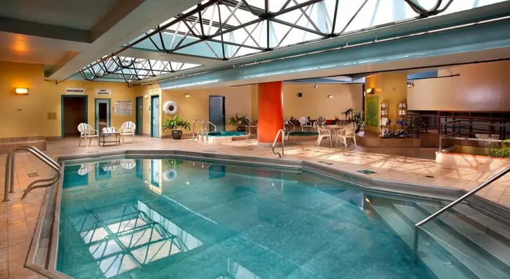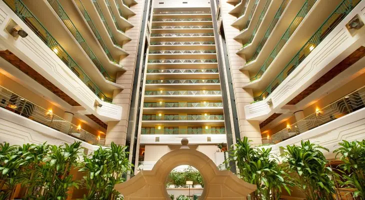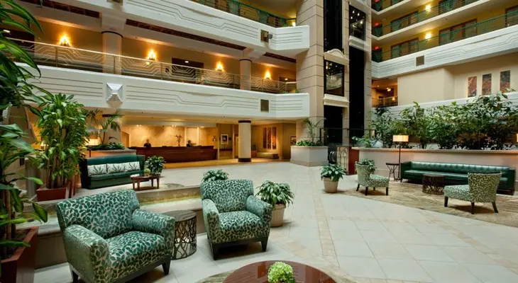 “As is the Embassy Suites way, this all-suite property opens up with an impressive atrium lobby and glass elevators.”