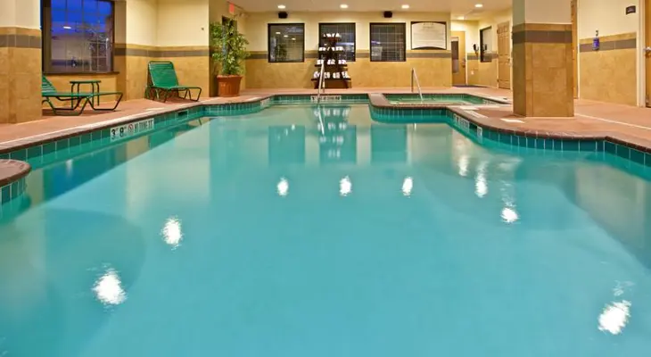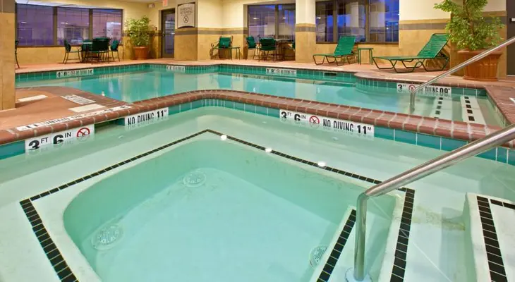 "This hotel is right next to Lucas Oil Stadium, and it features a complimentary hot breakfast buffet, an afternoon cocktail reception during the week and free laundry services."