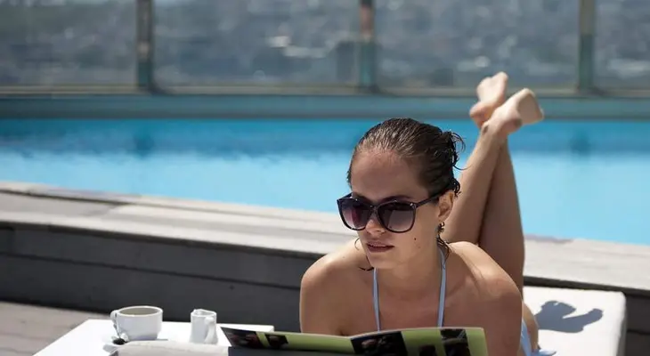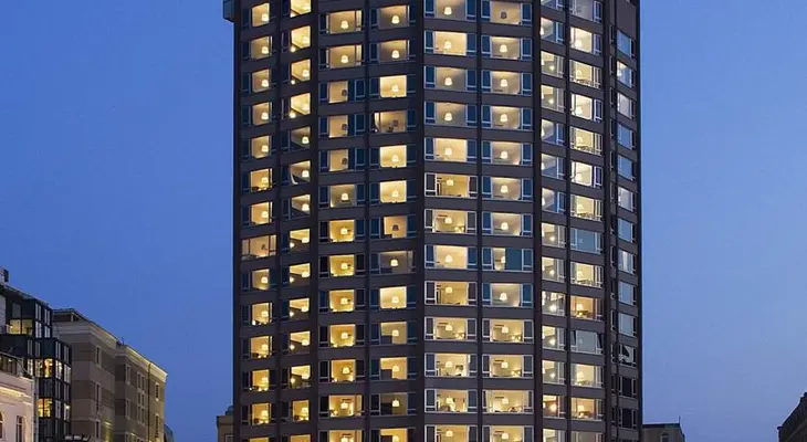“Sleek high-rise hotel with Midcentury-style rooms, a top-notch Scando-Turkish restaurant and a rooftop pool.”