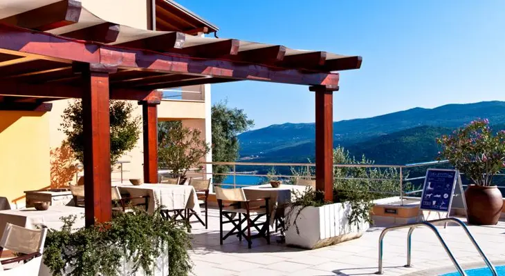 “This posh, family-run hideaway up on a hill slope has 12 suites and a wonderful outdoor pool providing dramatic bay views.”