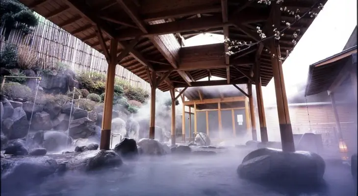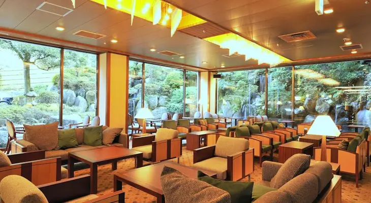 “This rambling hotel on the edge of the Sukumo-gawa has excellent Japanese- and Western-style rooms and baths including direct entry to the large Yu-no-Sato complex nearby.”
