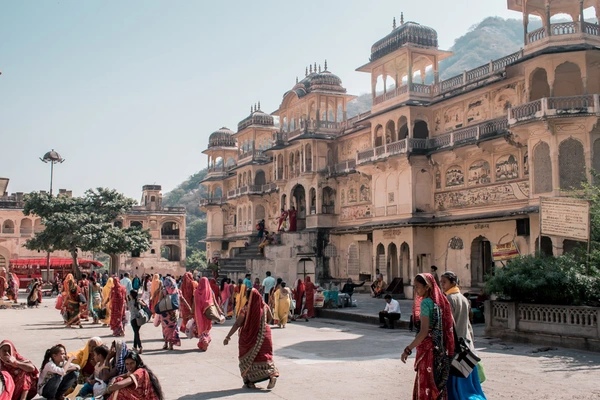 “The Galta temples, about a dozen temples built in the 18C, stand in the wild setting of a narrow, picturesque gorge that is populated by macaque monkeys.”