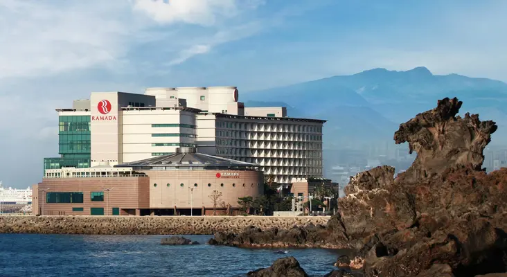 “With great views of the ocean and mountains, the Ramada is centrally located in downtown Jeju City and a five minute walk to the chic Tap-dong shopping district.”