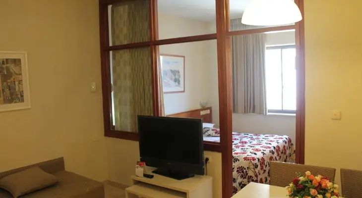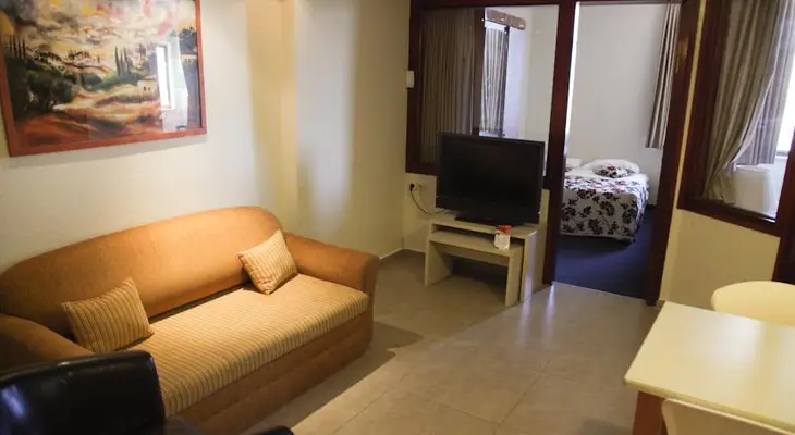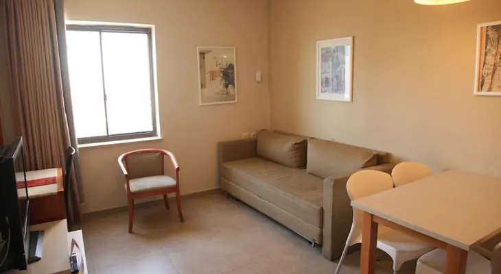 “The pleasant suites consist of a contemporary living room/kitchenette and bedroom freshly decorated in soft colors and soundproofed against the roar of downtown traffic.”