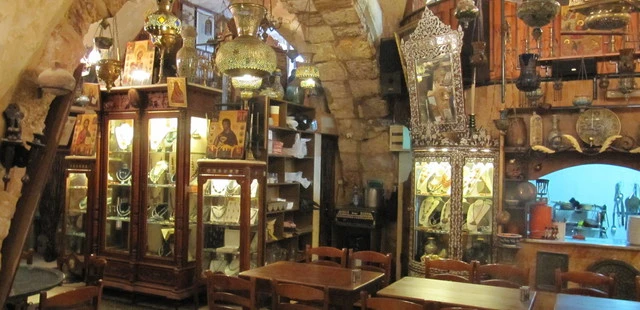 “Step down into the Crusader-era building, and pearl-embossed mirrors glitter, iron chandeliers dangle and antiques...the house wines are drinkable, and the food is more than decent”