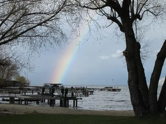 “This bright two-room B&B has a prime lakefront location, 6km south of the center, complete with its own tiny strip of sand.”