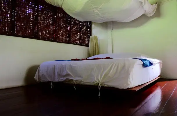 This is a terrific set of wood and bamboo bungalows with built-in platform beds, high palm-leaf ceilings, polished-wood floors, glass-bowl bathroom sinks and hammock-laden verandas. — Lonely Planet