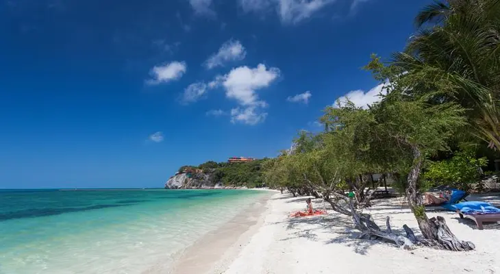 “Located along attractive Leela Beach, a five-minute walk from the action of Haad Rin, this upper-middle-range resort offers 49 contemporary rooms set amid a verdant garden.”