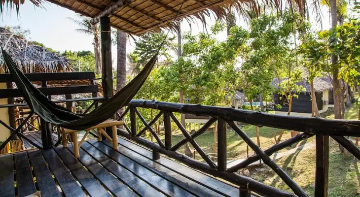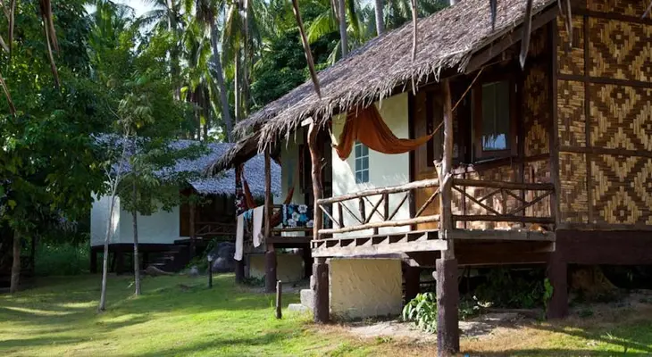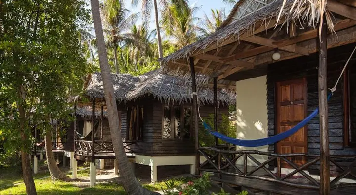 "On a broad, grassy bank beneath coconut trees behind the north end of the beach, the spacious, very attractive thatched bungalows here all come with hot water."