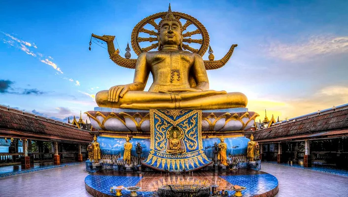 "Erected in 1972, the modern Buddha (sitting in the Mara posture) stands 15m high and makes an alluring silhouette against the tropical sky and sea." Full review