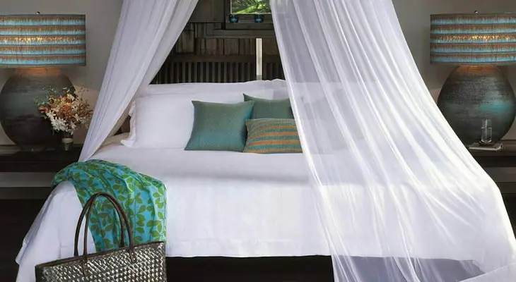 "Sprawled across palm-covered hills overlooking a cove, these luxurious villas on stilts have private infinity pools with sea views."