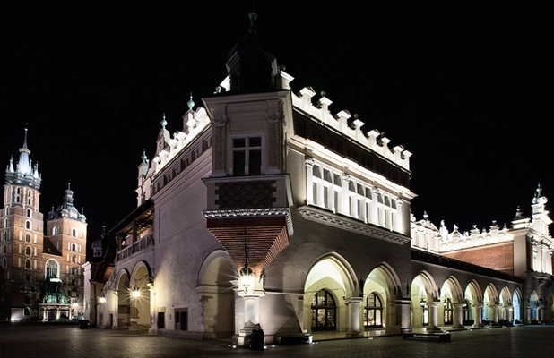 “A statue of Adam Mickiewicz marks the eastern entrance to the Renaissance Cloth Hall, which is in the middle of the Main Market Square. The Gothic arches date from the 14th century, but...”