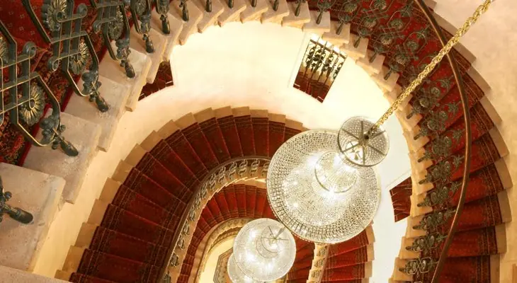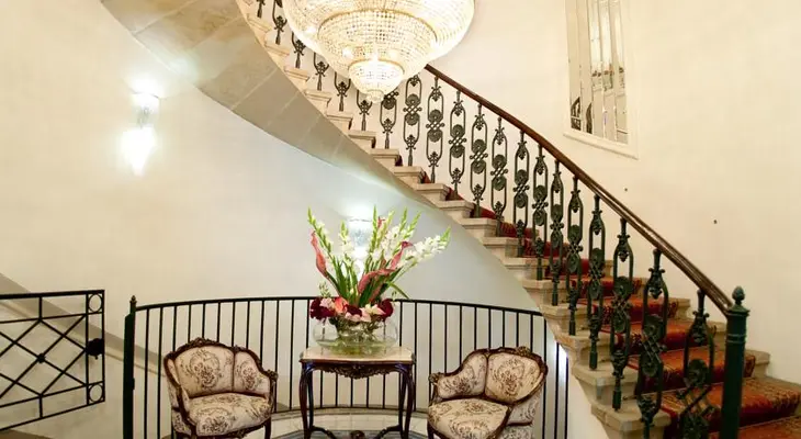 "Former palace, superbly located on the main square, featuring medieval portals, ornate ceilings... an impressive staircase and the largest Swarovski chandelier in Europe."