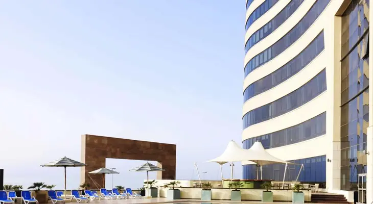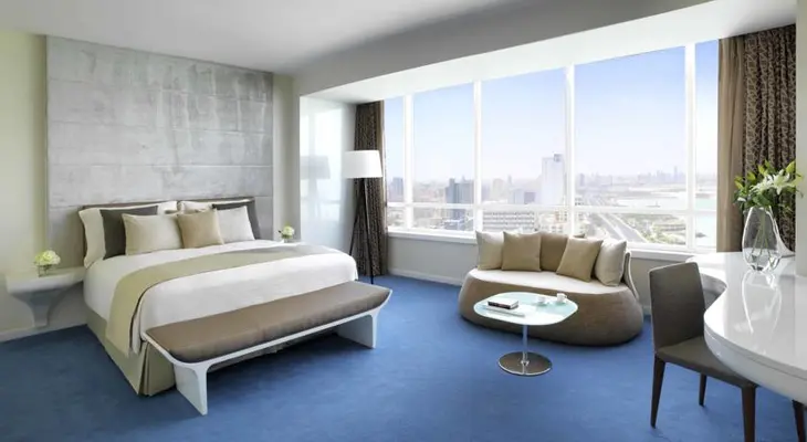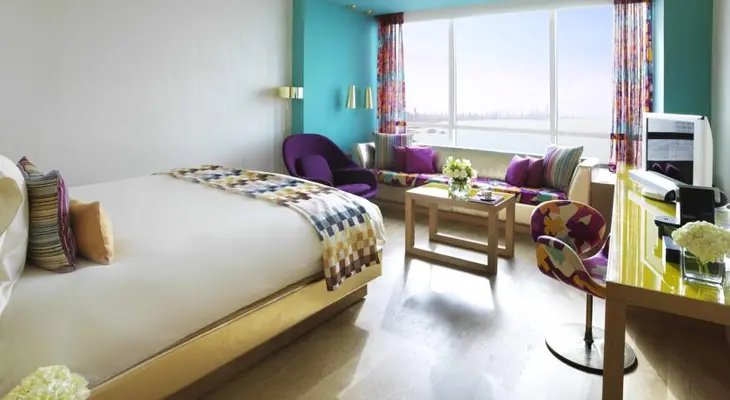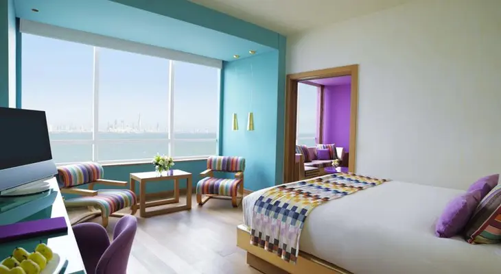 “An oasis of 169 candy-colored rooms within an 18-floor tower overlooking Kuwait Bay.”