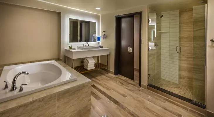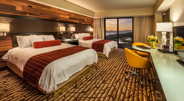 “The 437 rooms and suites here at are clean and bright, and the indoor pool with its own artificial waterfall is a highlight. There are also a casino, a spa, and a handful of restaurants.”