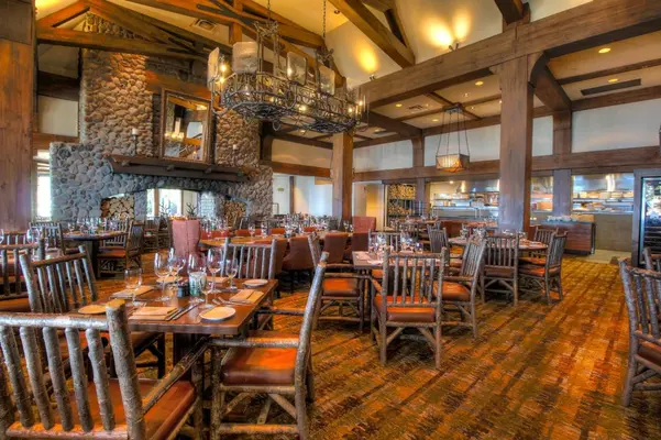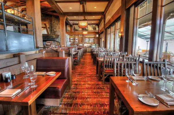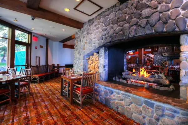 "Seasonal high-Sierra cuisine is served with views of Lake Tahoe in a setting that includes panoramic windows, wood beams, stone fireplace, and lodge-style decor"
