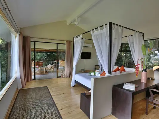 “Choose between one of six inviting studios, three large suites or one of the vast-feeling two-bedroom cottages; all are stylish and airy with balconies overlooking the rainforest and sea below.”