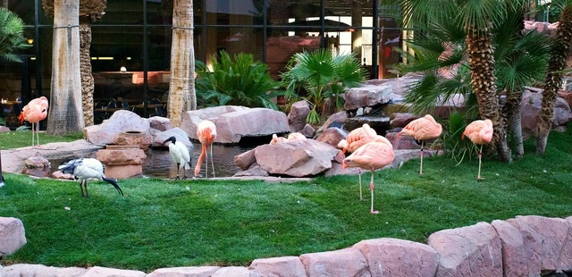 "Just next to the Flamingo's pool area, a flamboyance of live Chilean flamingos, swans, ducks, koi, goldfish, and turtles live on islands and in streams surrounded by sparkling waterfalls and lush foliage." Full review