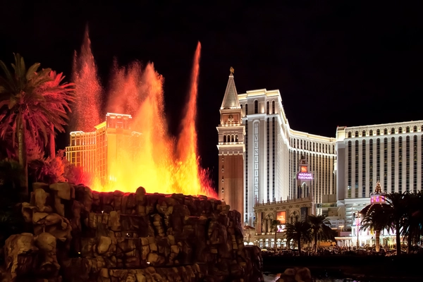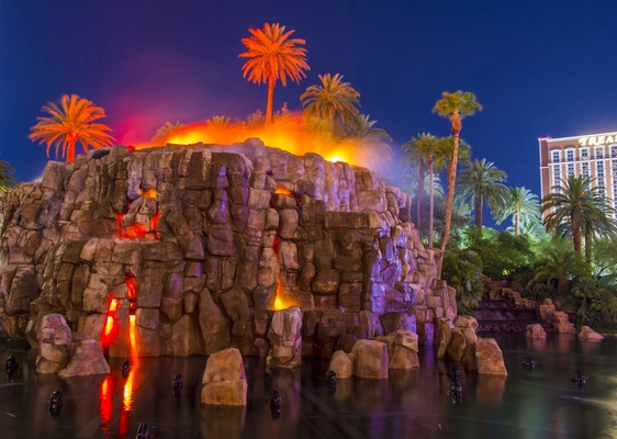 “This erupting volcano, a 54-foot mountain-fountain surrounded by a lake of miniature fire spouts, is a must-see free attraction on the Strip.”