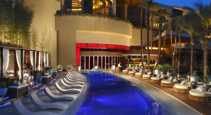 "This hip resort, located half an hour from the Strip, boasts an impressive pool, notable spa, multiplex movie theater, and 72-lane bowling alley." Full review