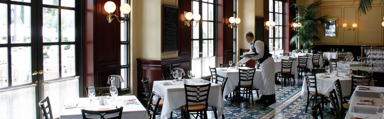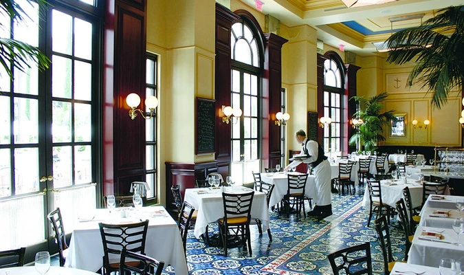 "Thomas Keller’s take on a Parisian bistro feels nothing like Vegas, with a pewter-topped bar, Duchamp-inspired murals, and view onto a French-style courtyard."