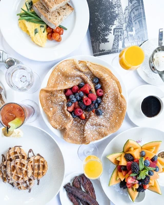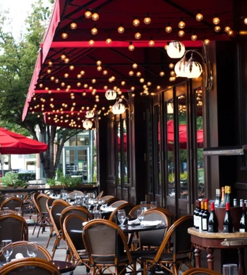 "Menu highlights at this Baroque- style, authentic Parisian bistro include the onion soup, steak frites, and strawberry crêpes."