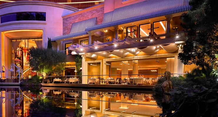 "Meaty-chic destination eatery overlooking the Wynn lagoon and waterfall offers a marble-encrusted dining room with high ceilings and romantic flair."