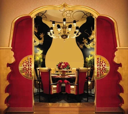 "Gleaming gold and cool jade hues, ornate fabric-covered walls and throne-like chairs backed with gold lamé set off this tony Michelin-starred dining room." Full review