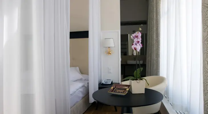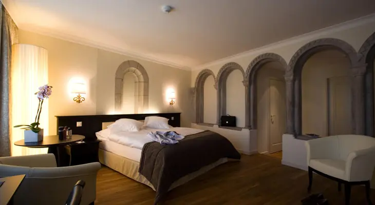 “Inside, the rooms are slick and comfortable, decorated in tones of cream and brown. The grounds include an outdoor swimming pool and spa area with hammam and sauna.”