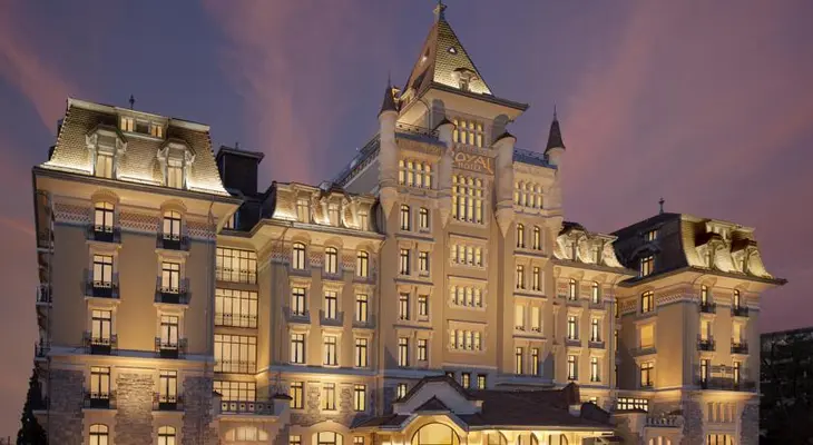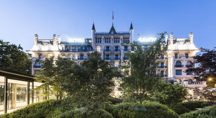 “The Royal Savoy Lausanne, an imposing Art Nouveau structure with turrets that rise between gigantic listed pines, is a sleek affair in shades of grey.”
