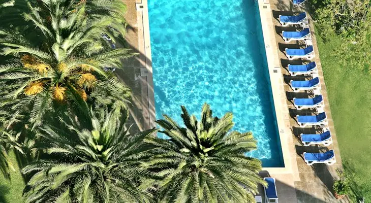 “On-site amenities are aplenty, including a restaurant and tapas bar, a lovely outdoor pool, and a bright and airy fitness center equipped with modern machines, plus a handful of shops are on-site.”