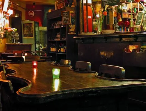 "An Argentinian coffee shop and restaurant with old wooden tables, where the waitresses, dressed in black, serve while dancing to the music of the tango."