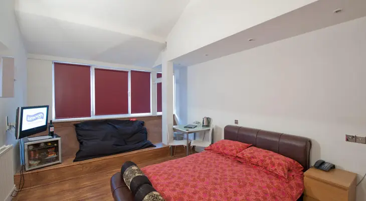 “A cool, quirky 12-bedroom hotel located in the lively Ropewalks district, with two popular bars open at weekends and a working recording studio on site.”