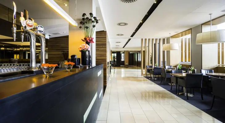 "Sleek, minimalist design distinguishes this City business hotel, where striking black-and-white photos of local landmarks add visual interest throughout."