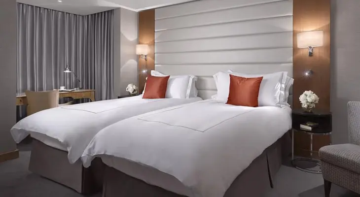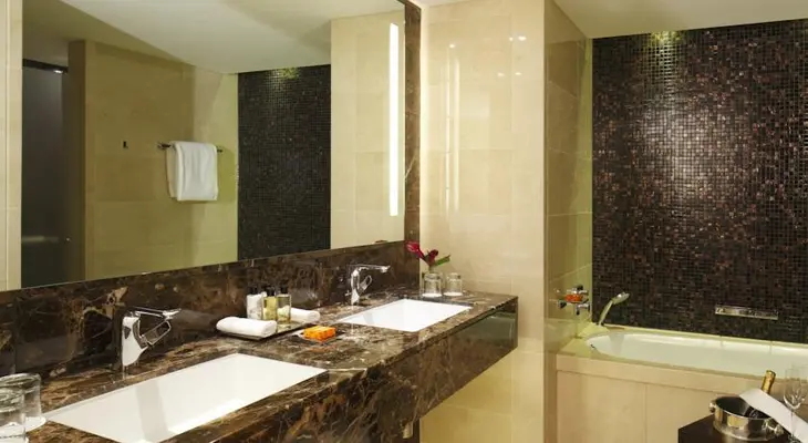 “The hotel's 256 rooms have refined, modern decor, luxurious marble bathrooms with separate bathtubs and rainfall showers, and high-end amenities.”