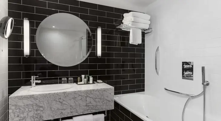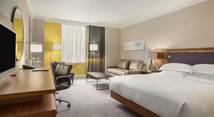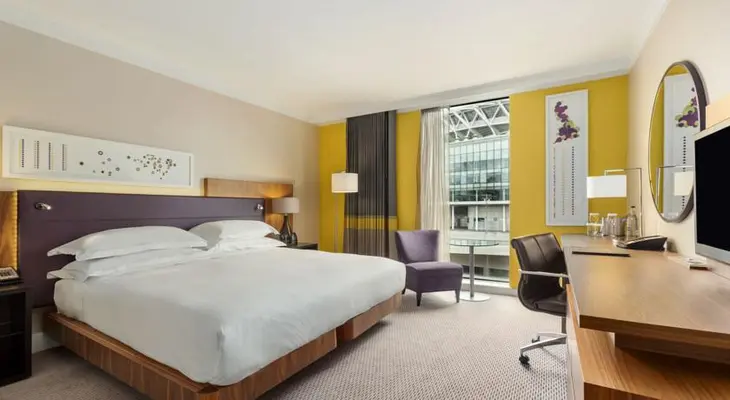 “The upscale Hilton London Wembley is a striking, modern property with 361 spacious, stylish rooms, some with Wembley Stadium views.”