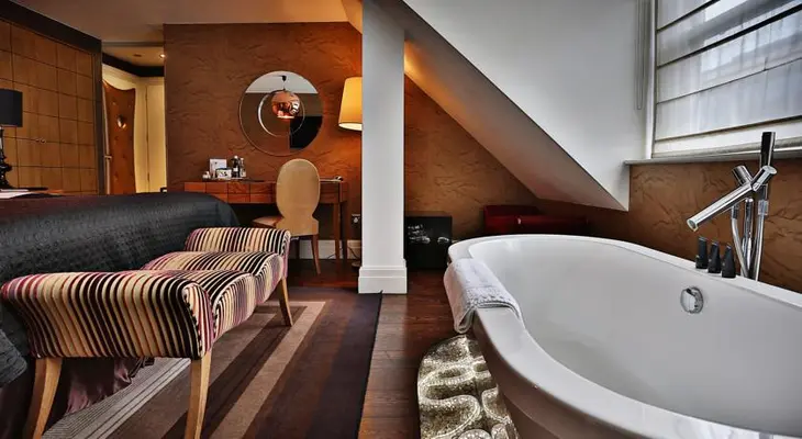 "Crowned by a roof terrace bar complete with its own hot tub, this Soho boutique hotel inhabiting two former Georgian townhouses is also known for its basement cinema."