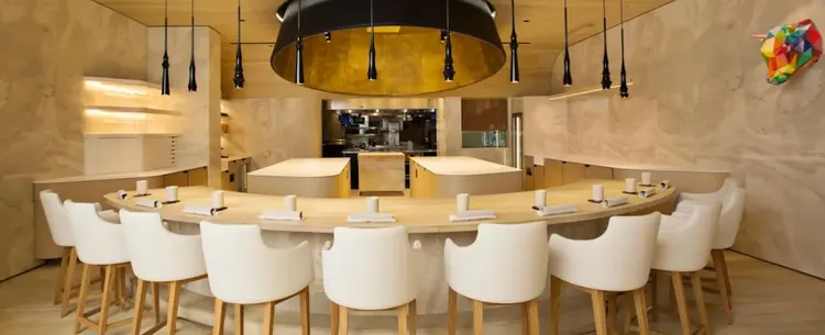"A horseshoe dining table that seats just ten people draws the eye to the exhibition kitchen and large golden dome, which illuminates the dishes that make up a 20-course tasting menu. " Full review