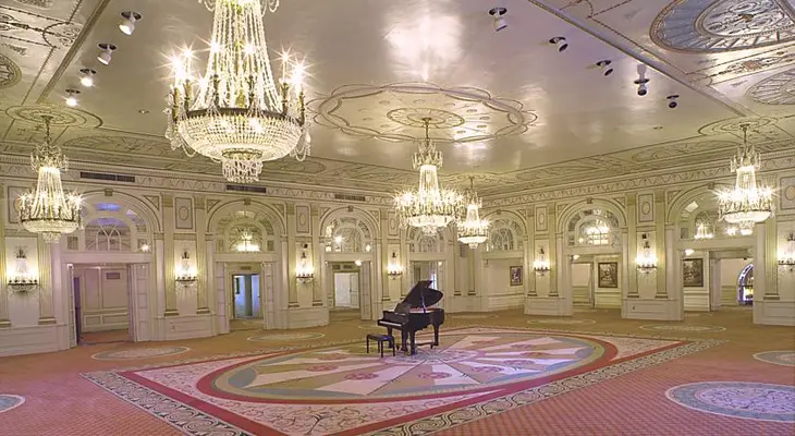 "The two-story lobby features a hand-painted coffered ceiling, Palladian-style windows, and mahogany furniture on Bottocino limestone floors." Full review
