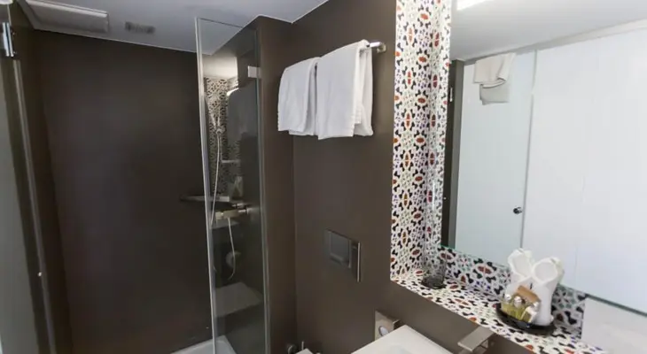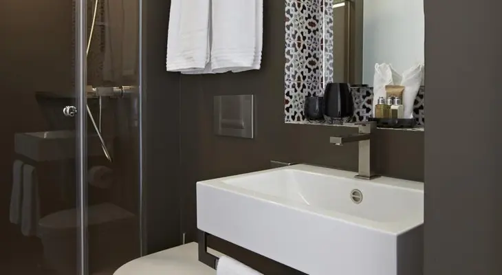 “The decor is subtle, modern, and minimal, with gleaming white paint and bedding, plus Moroccan tiling details in the bathrooms, and some rooms even feature period details.”