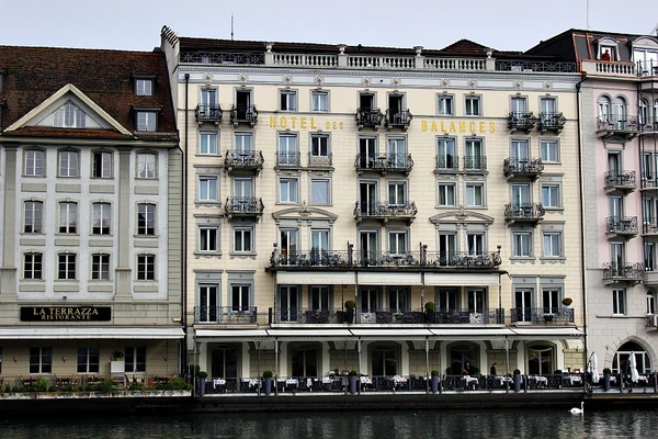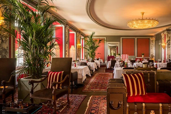 The hotel's mansarded facade stretches the length of two city blocks, dominating the lakeside promenade. Brass, marble, and inlaid wood accent the high-ceilinged Empire-style guest rooms. — Fodor's