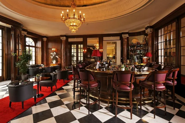 “The hotel's mansarded facade stretches the length of two city blocks, dominating the lakeside promenade. Brass, marble, and inlaid wood accent the high-ceilinged Empire-style guest rooms.”